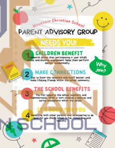The next meeting for PAG is on Thursday, Dec 5th at 6:30 pm at the Alpha campus.Parents, please consider attending and possibly joining. Your support and opinions are important!Thank you.Category: Schoolwide NewsBy MCS OmegaNovember 26, 2024Share This Article Share on FacebookShare on Facebook Share on XShare on X Pin itShare on Pinterest Share on LinkedInShare on LinkedInAuthor: MCS OmegaPost navigationPreviousPrevious post:Photo Re-Take Day on Friday!NextNext post:Medical WaiversRelated PostsDinner Theatre at Omega CampusDecember 5, 2025First Aid Fundraiser Pickup TOMORROWNovember 3, 2025Photo Re-Take Day Nov. 7October 21, 2025Family Movie Night!October 21, 2025First Aid Fundraiser Deadline!October 7, 2025Photo Re-Take Day date change!October 7, 2025